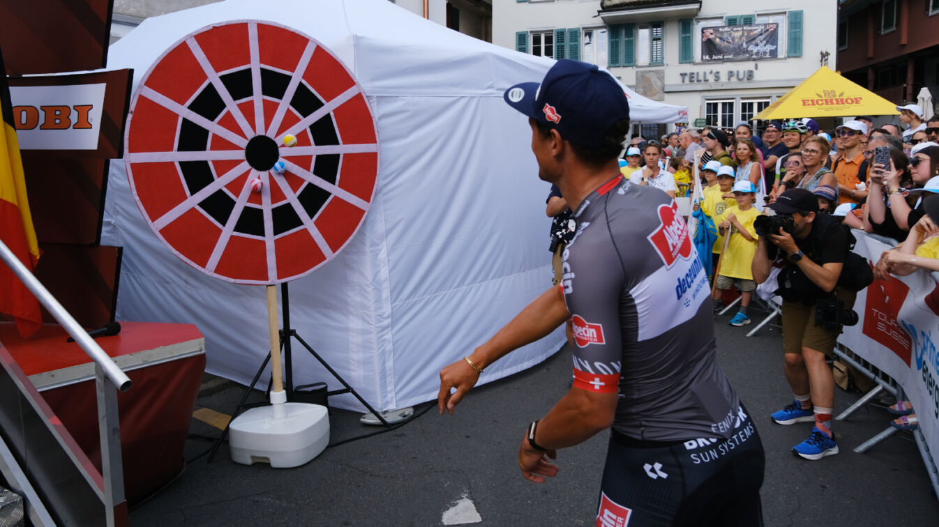 fab. Die Menschenansammlung auf dem Hauptplatz unterstreicht unmissverständlich: Küssnacht ist im Tour-de-Suisse-Fieber. Das wusste Tourdirektor Olivier Senn ausdrücklich zu würdigen, als er um 17.30 Uhr das Publikum begrüsste: «Die Tour de Suisse ist nicht nur ein Velorennen, sondern ein Volksfest», sagte er und zeigte sich überaus zufrieden mit dem ersten Tour-de-Suisse-Tag in Küssnacht. Senn dankte den zahlreichen Helfern und speziell dem lokalen Organisationskomitee unter der Leitung von Urs Durrer. Dieser lobte die grossartige Kulisse und freute sich, dass die ersten Gewitter hinter und nicht vor der Rigi durchzogen. Durrer wünschte allen ein schönes Fest, ehe die Teams auf die Bühne traten. Als Erstes präsentierte sich das Team Alpecin-Deceunick mit dem Schweizer Rennfahrer Silvan Dillier dem Publikum und bestritt – in Anlehnung an Wilhelm Tell – ein kleines Wurfspiel.
