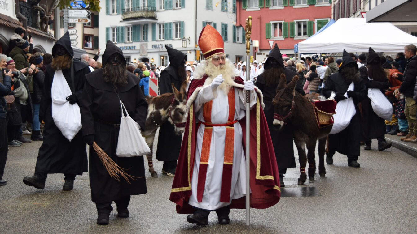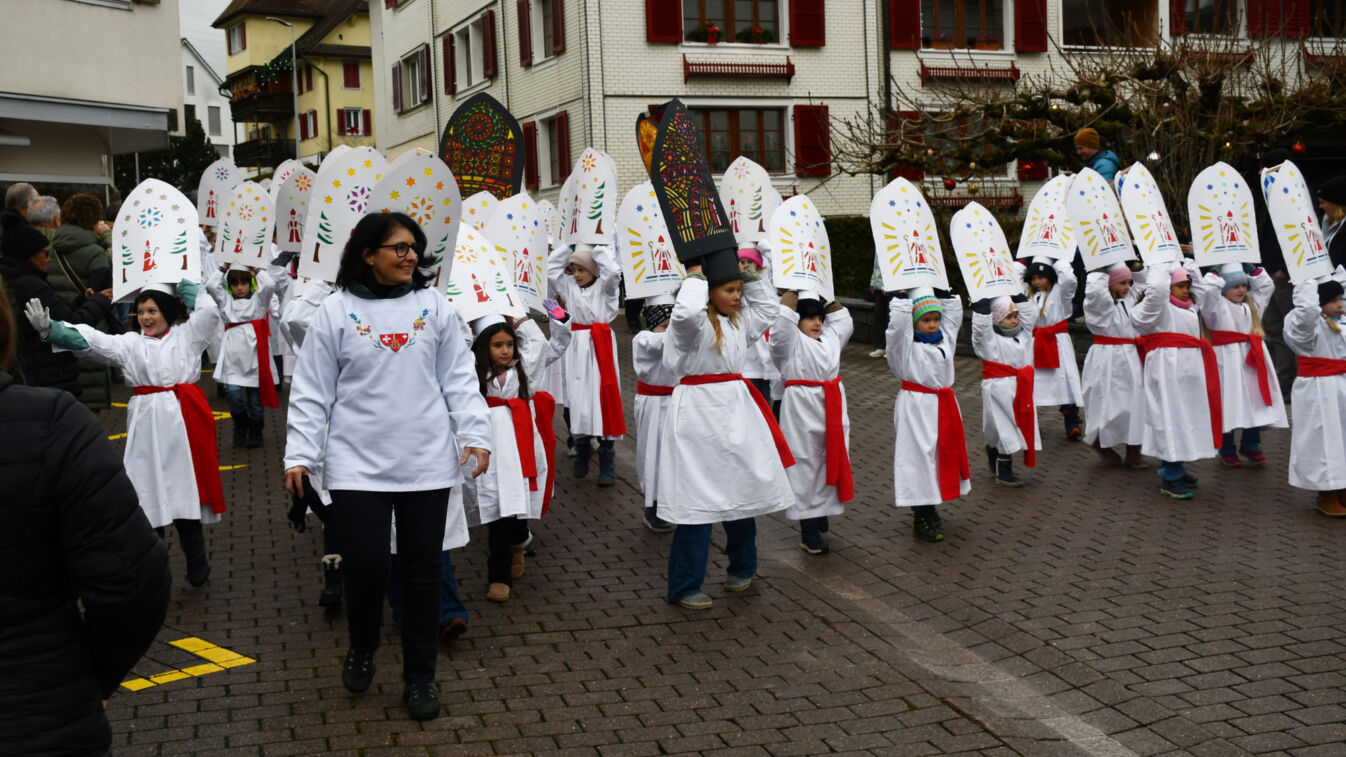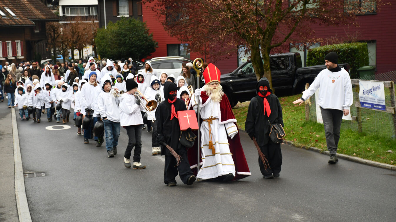 cp. Für den Küssnachter Kinderumzug versammelten sich die Kinder bei der reformierten Kirche. Schon bald zogen sie vom Ober- ins Unterdorf und durch die Bahnhofstrasse. Geisselchlepfer, Iffeleträger, drei Musikanten und viele Trychler waren dabei. Natürlich durfte auch der Samichlaus mit seinem Gefolge nicht fehlen. So ähnlich sah es in Immensee aus. Auch dort zeigten die Jüngsten ihr Können.