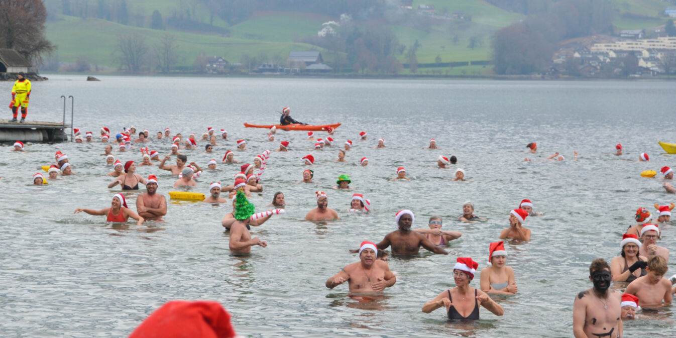 Auch nach über 30 Jahren hat Dorly Hunkelers Samichlaus-Schwimmen nichts an Anziehungskraft verloren: Rund 200 Besucher trafen sich am Sonntag in der Merlischacher Badi. Knapp die Hälfte davon wagte sich auch ins kalte Nass.
